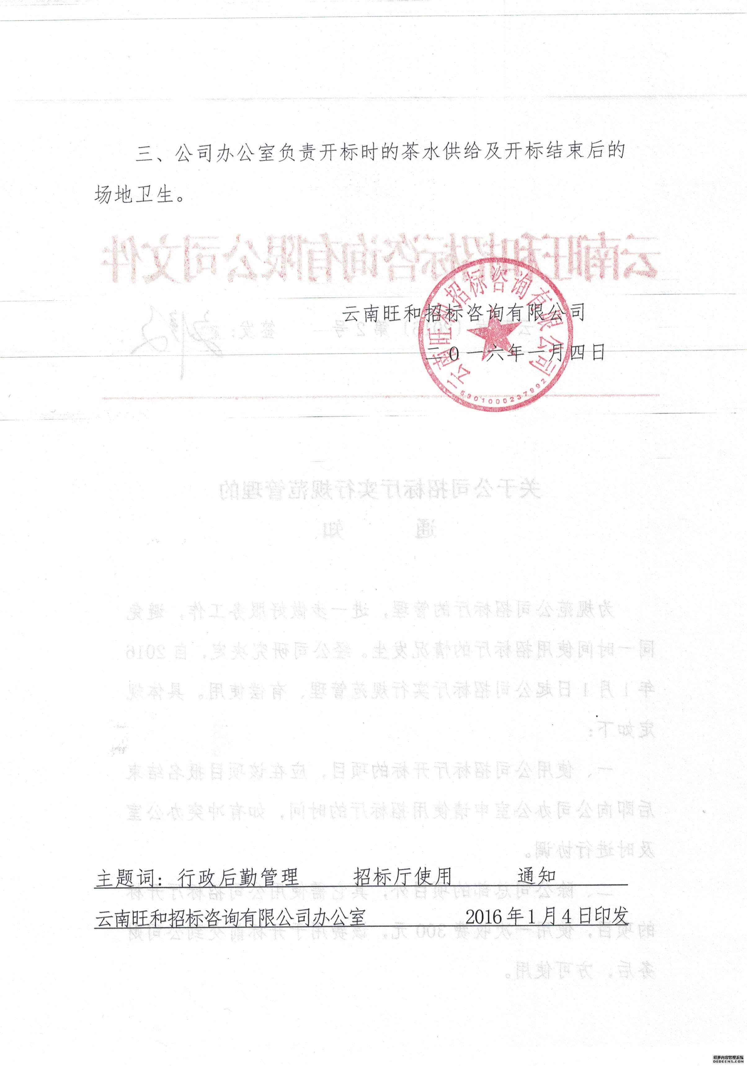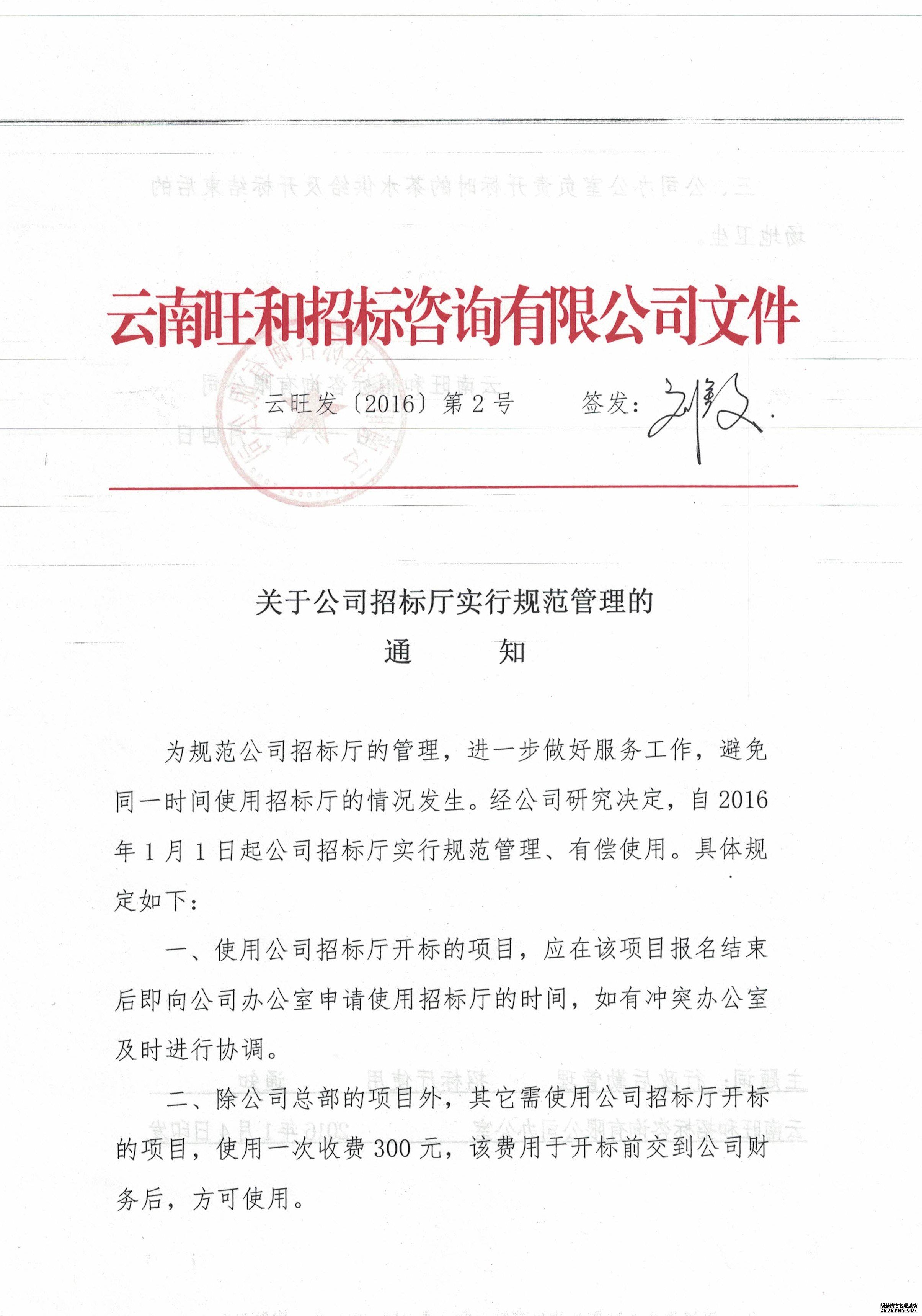 为规范公司招标厅的管理,进一步做好服务工作,避免同一时间使用招标厅的情况发生。经公司研究决定,自2016年1月1日起公司招标厅实行规范管理、有偿使用。具体规定如下:
