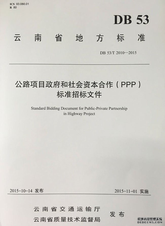 昆明信息港讯 记者上官艳君15日,记者从云南省交通运输厅获悉,为规范公路建设领域的政府和社会资本合作(PPP)建设模式,云南《公路项目政府与社会资本合作标准招标文件》正式发布,并于今年11月1日起开始实施。这是我国公路行业发布的第一部PPP领域的标准招标文件。