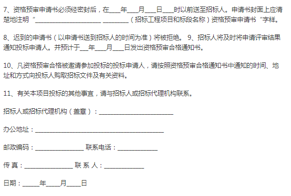 有关投标邀请书发出时间的法律、法规没有规定强制性期限。只要被邀请的潜在投标人有合理的时间来决定是否参加投标竞争并满足投标进度要求。在实践中,招标人可以根据工程需要安排招标文件的发出时间。为便于控制,可以要求收到招标邀请的潜在投标人在规定的期限内答复招标人确认是否参加投标。