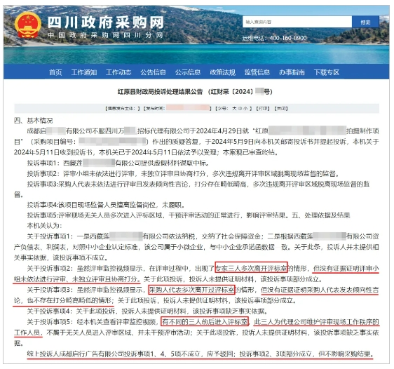 根据相关法律的规定,红原县财政局决定:投诉事项2、3部分成立,但不影响采购结果,继续开展采购活动;针对在项目评审过程中,代理机构未做好评审现场秩序工作,本机关责令改正、给予批评。